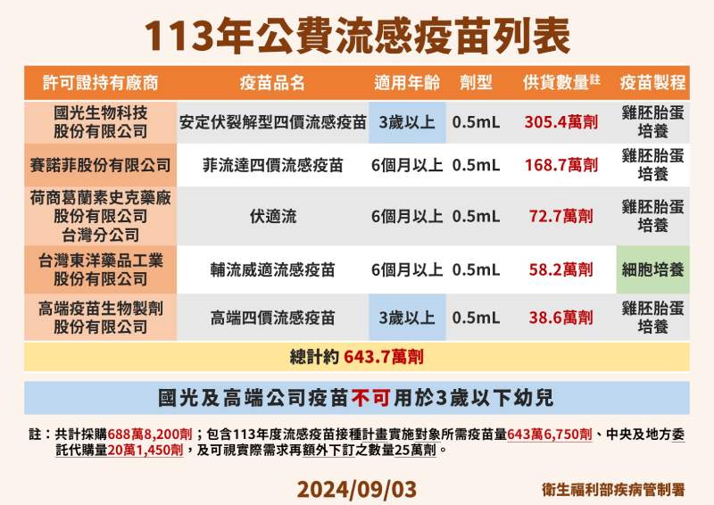 今 (114) 年提供公費流感疫苗共有5家廠牌,皆屬不活化三價流感疫苗,各廠牌之效果與安全性均同。但公費疫苗由衛生局隨機分發,無法選擇廠牌。接種疫苗的免疫力在大約兩週後開始發揮作用。